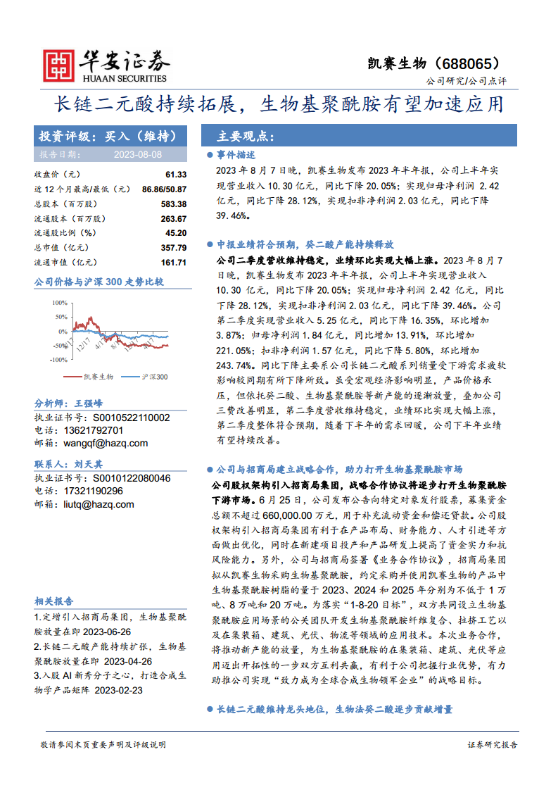 凯赛生物2023年上半年业绩虽受下游需求疲软影响同比下降,但第二季度环比显著改善,符合市场预期,并预计下半年将持续向好。公司通过引入招商局集团进行战略合作,不仅优化了股权结构和财务能力,更获得了招商局集团在生物基聚酰胺采购方面的明确承诺,为生物基聚酰胺产品的市场拓展和新产能释放奠定了坚实基础。