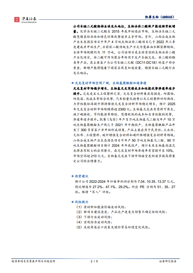 根据分析师预测,凯赛生物2022-2024年归母净利润分别为7.04亿元、10.35亿元、13.37亿元,同比增速分别为27.2%、47.1%、29.2%。对应PE分别为51倍、35倍、27倍。鉴于公司在生物基材料领域的领先地位、新产能的逐步释放以及战略合作带来的市场机遇,维持“买入”评级。