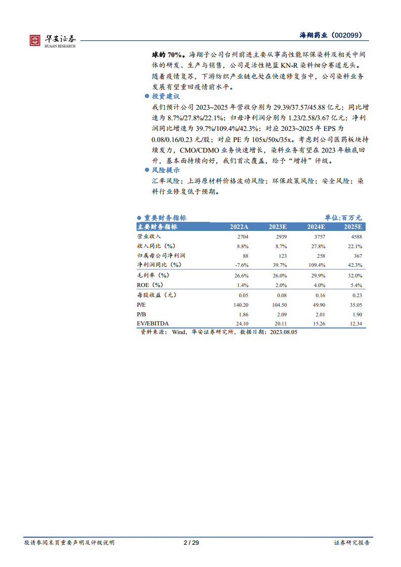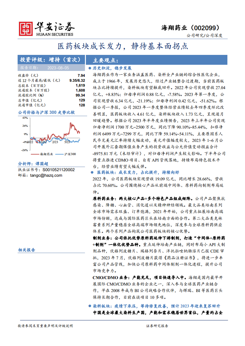 中心思想 医药业务驱动增长,染料板块蓄势待发 海翔药业作为一家拥有深厚历史积淀的综合性医化企业,其核心业务正逐步向医药板块倾斜,该板块已成为公司业绩增长的主要驱动力。 公司在抗感染、降糖、心血管等特色原料药领域拥有培南和克林霉素两大核心产品系列,在全球市场占据领先地位并持续拓展高端合作。 同时,公司积极布局下游制剂业务,并凭借其早期进入国际CMO/CDMO市场的优势,与全球知名药企建立长期合作关系,该业务正快速导入新项目,有望成为未来新的增长点。 染料板块虽受疫情影响短期承压,但随着下游纺织产业链的修复,预计将在2023年下半年触底回升,为公司整体业绩贡献积极力量。 短期业绩承压,长期基本面改善 尽管公司在2023年上半年受到人民币兑美元汇率大幅波动导致的外汇套期保值损失(-8975.81万元)影响,归母净利润同比大幅下降,但扣非净利润降幅相对较小,且医药板块收入保持稳健增长。 公司通过持续的资本性投入扩建生产线,优化“中间体+原料药+制剂”一体化产业平台,产能利用率和资产使用效率正迈入上升通道。