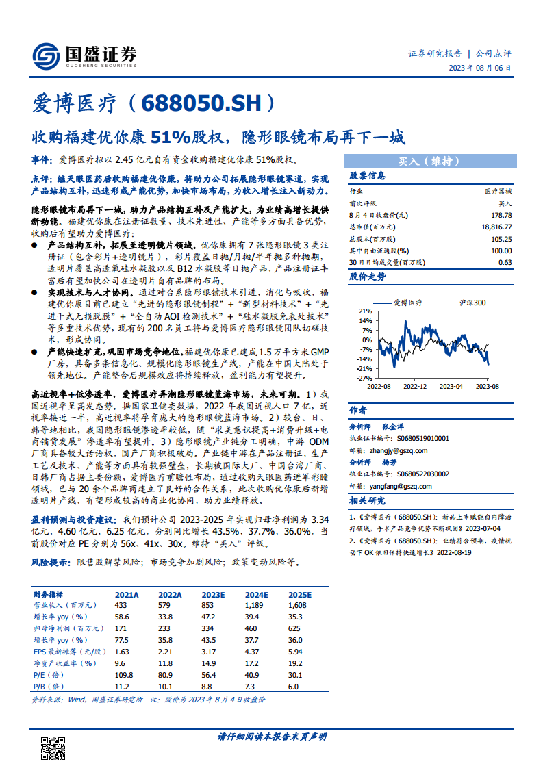 中国庞大的近视人口(2022年达7亿)与相对较低的隐形眼镜渗透率共同构成了巨大的蓝海市场。爱博医疗通过此次收购,将进一步完善其在彩片和透明镜片领域的产品线,并利用优你康的先进技术和领先产能,有望在这一高增长市场中占据有利地位。分析师预计,公司2023-2025年归母净利润将分别实现43.5%、37.7%和36.0%的同比增长,维持“买入”评级,显示出市场对其未来增长潜力的积极预期。