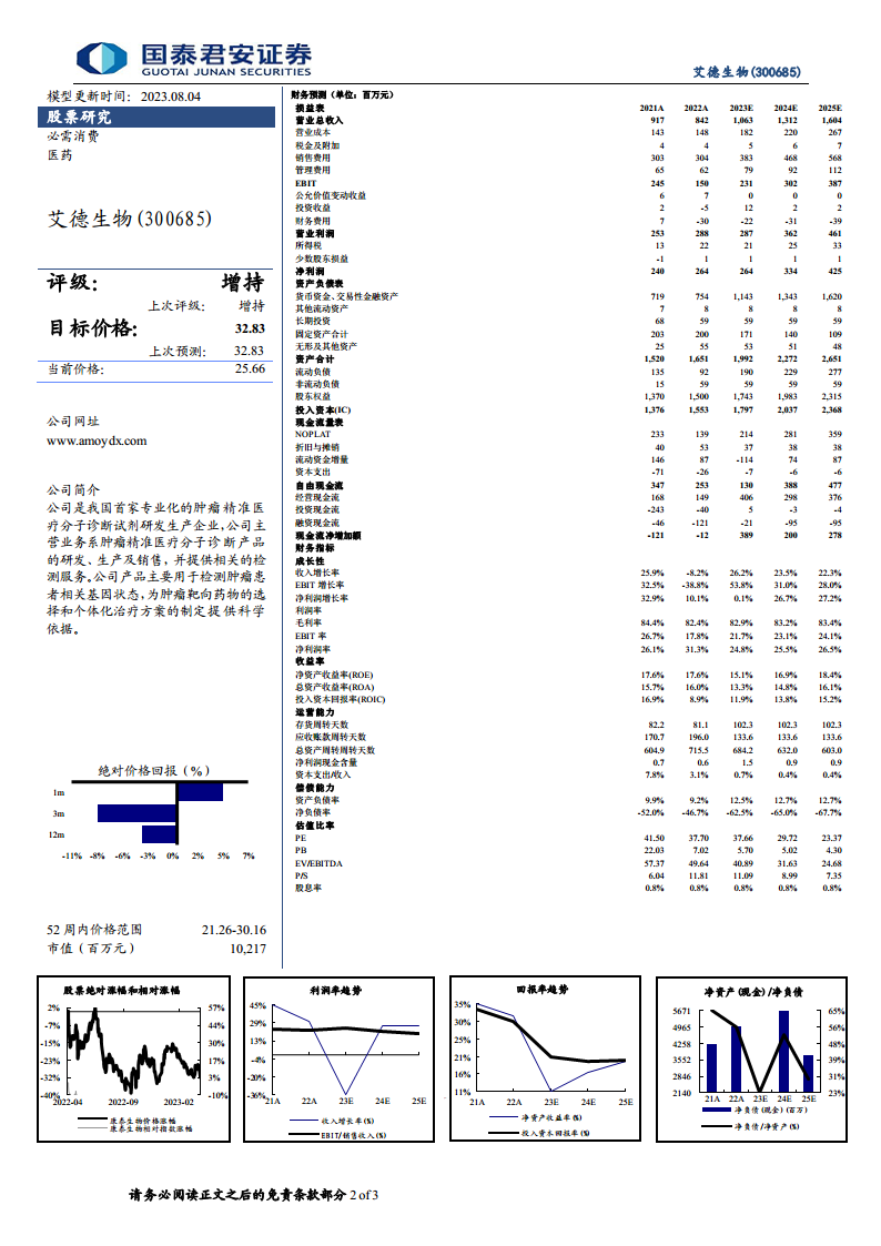 分析师根据艾德生物新产品市场拓展的顺利情况,将2023年至2025年的EPS预测分别上调至0.66元、0.84元和1.07元(原预测2024年为0.78元)。公司目标价格维持在32.83元,对应2023年PE为50倍,并维持“增持”评级。
