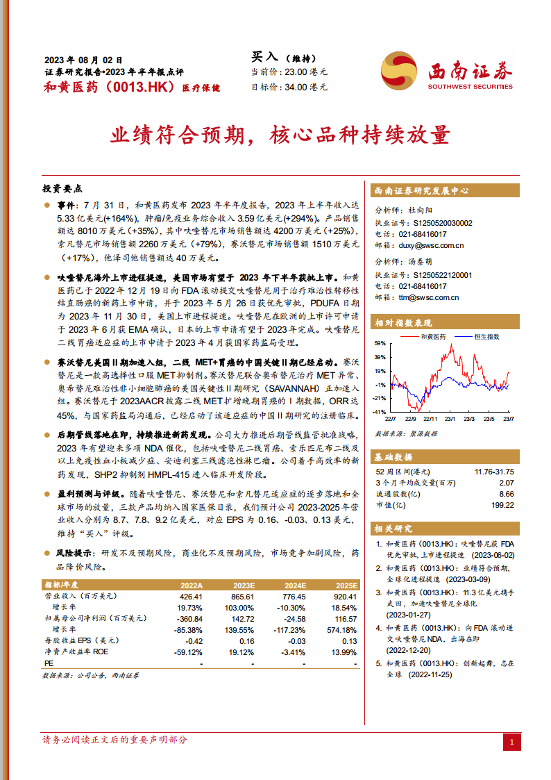 和黄医药在2023年上半年展现出强劲的财务表现,总收入和肿瘤/免疫业务收入均实现大幅增长,核心产品如呋喹替尼、索凡替尼和赛沃替尼的市场销售额持续放量,成为公司业绩增长的主要驱动力。这表明公司在产品商业化和市场渗透方面取得了显著成效。