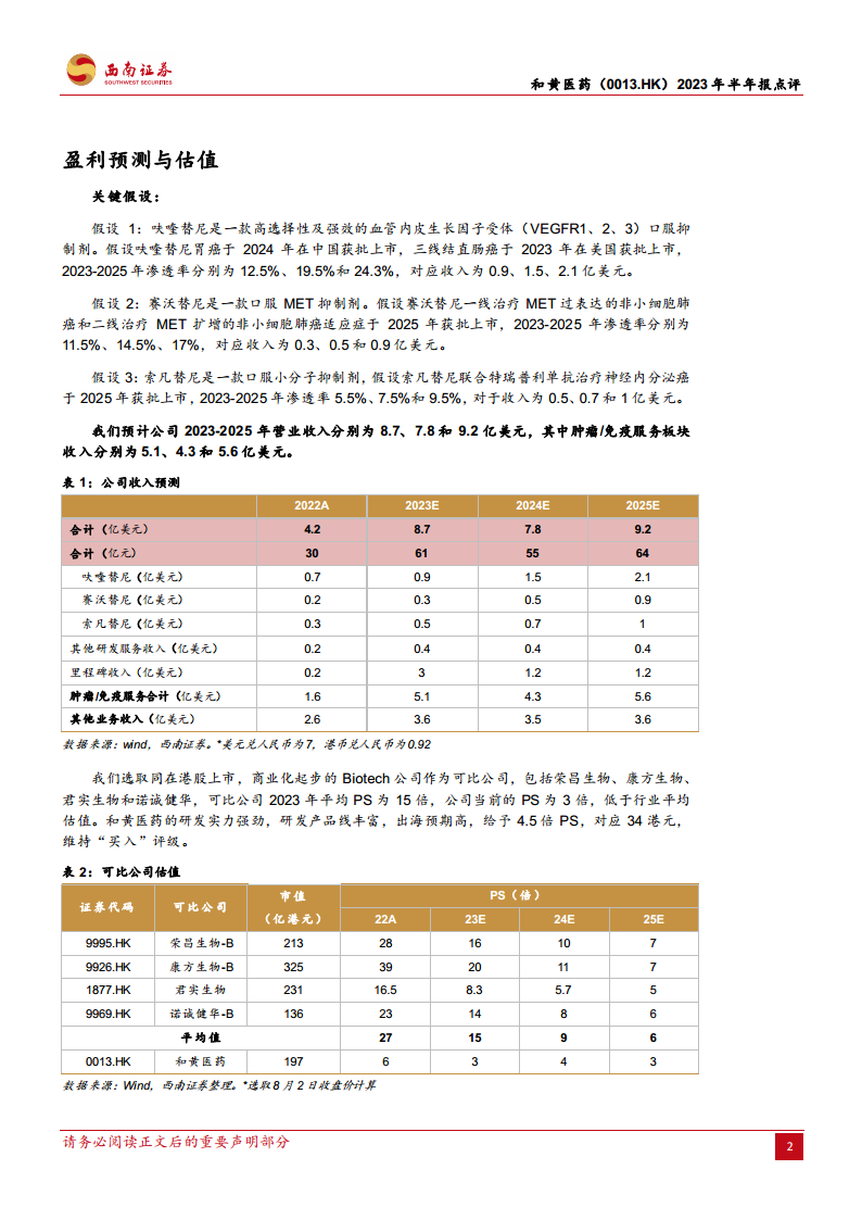 此外,报告对索凡替尼的未来市场也进行了预测。关键假设索凡替尼联合特瑞普利单抗治疗神经内分泌癌将于2025年获批上市。预计2023年至2025年,其渗透率将分别达到5.5%、7.5%和9.5%,对应收入分别为0.5亿美元、0.7亿美元和1亿美元。