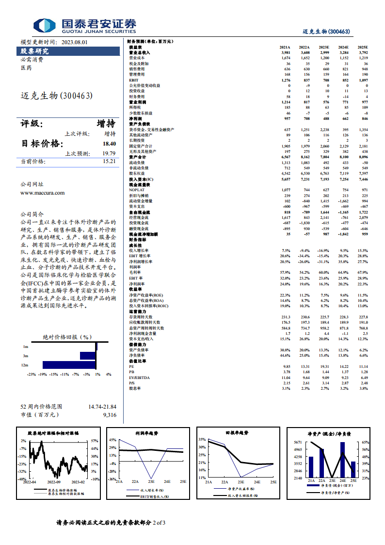 迈克生物2023年上半年业绩受到新冠分子产品市场需求骤降及资产减值准备计提的显著影响,导致营收和净利润同比大幅下滑。尽管面临短期挑战,公司积极推进业务结构调整,自主常规试剂业务表现出稳健增长态势,尤其在免疫、生化和临检试剂领域。同时,公司在全实验室智能化检验分析流水线的推广方面取得突破,大型仪器出库量和国内外市场覆盖率均有提升,为未来试剂销售增长奠定了基础。分析师维持“增持”评级,但基于短期业绩压力和费用投入,下调了盈利预测和目标价。公司未来的增长将主要依赖于自主常规试剂的持续增长、流水线产品的市场渗透以及新市场的有效开拓,同时需警惕新品推广不及预期和产品集采降价的风险。