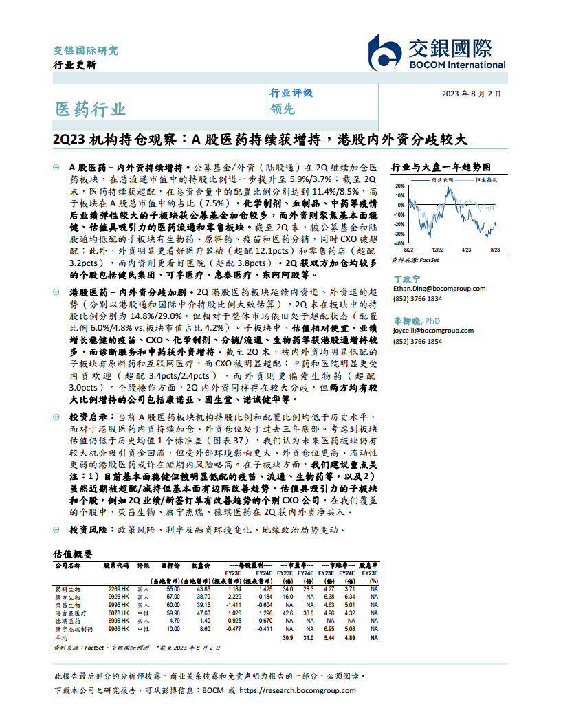 2Q23机构持仓观察:A股医药持续获增持,港股内外资分歧较大