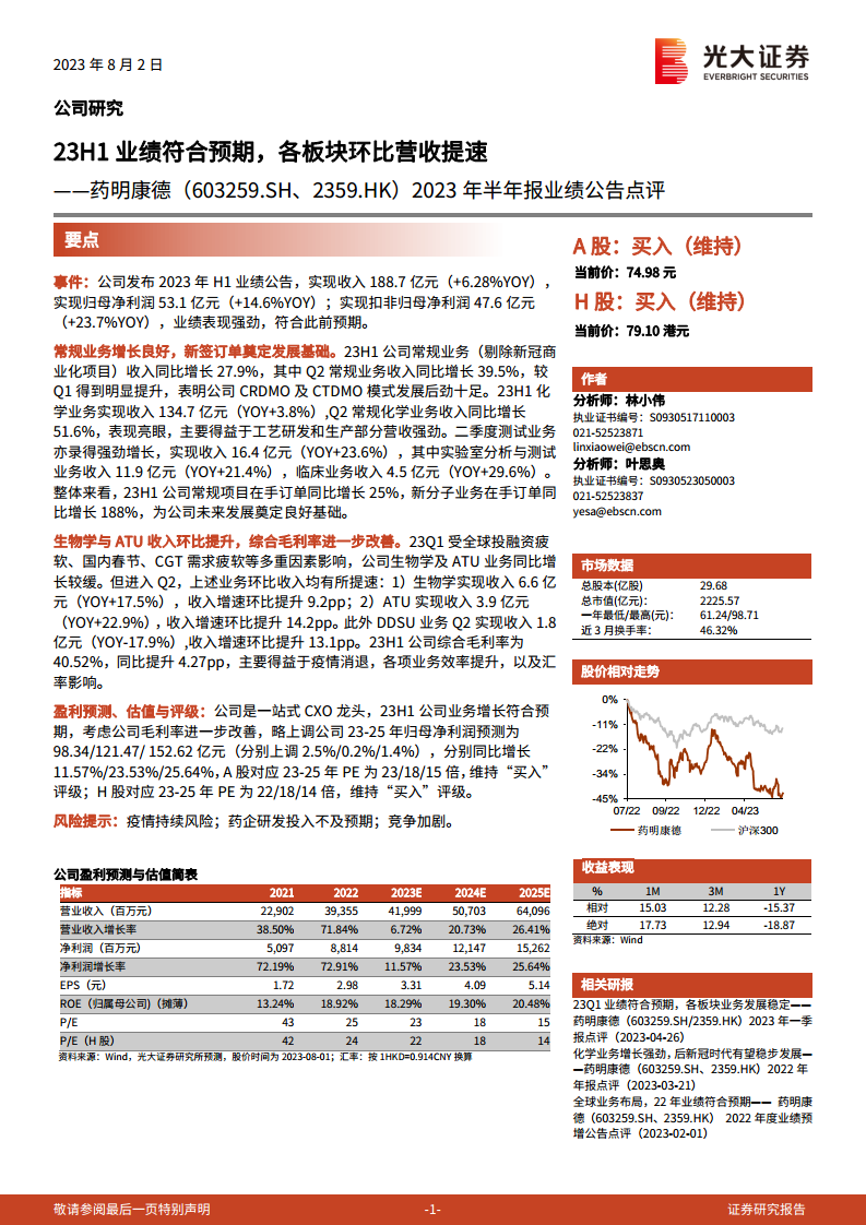 分析师认为药明康德作为一站式CXO龙头,23H1业务增长符合预期,且毛利率进一步改善。基于此,略上调了公司2023-2025年归母净利润预测,分别为98.34亿元、121.47亿元和152.62亿元,分别同比增长11.57%、23.53%和25.64%。A股和H股均维持“买入”评级,A股对应23-25年PE为23/18/15倍,H股对应23-25年PE为22/18/14倍。