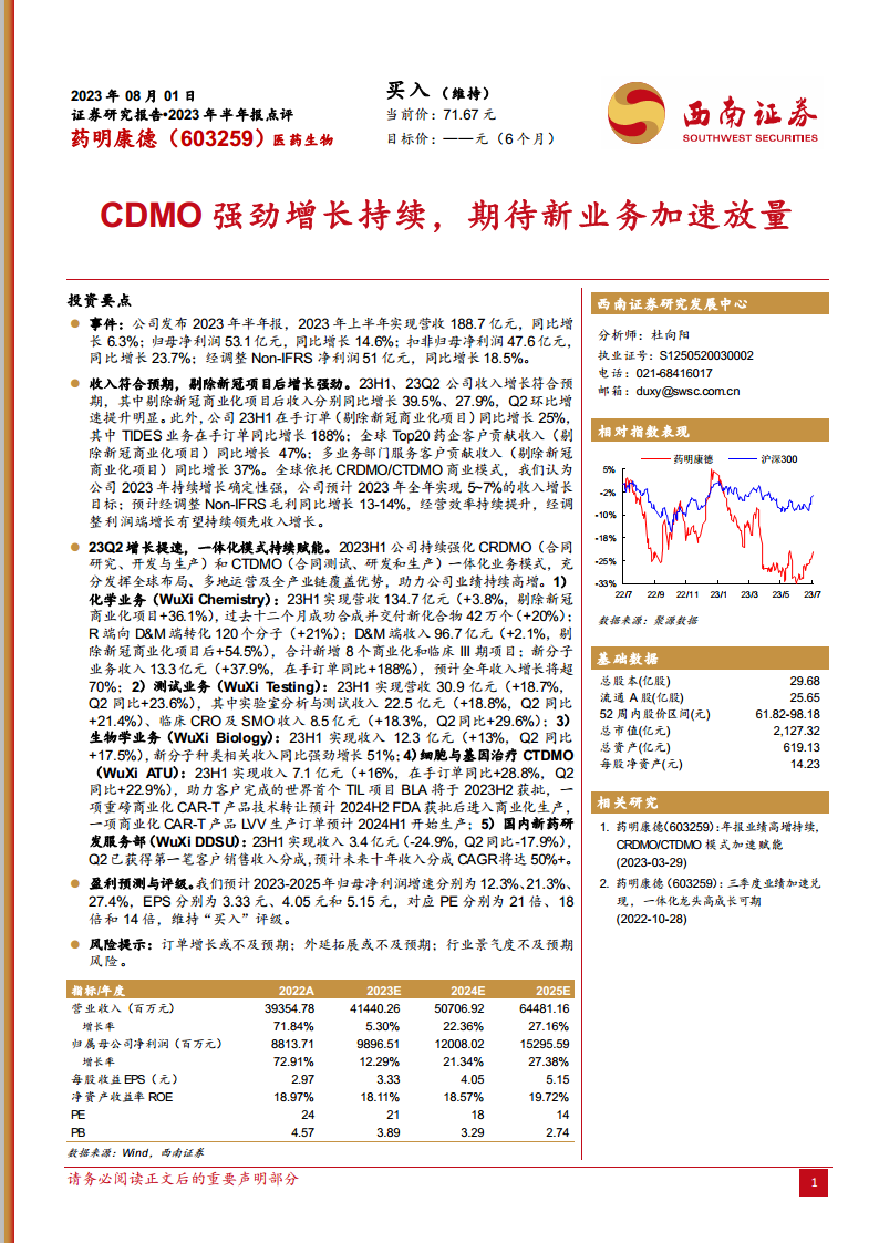 药明康德在2023年上半年展现出稳健的财务表现,营收和净利润均实现增长。尤其是在剔除新冠商业化项目后,公司核心业务的强劲增长势头和不断增加的在手订单,充分证明了其CRDMO/CTDMO一体化业务模式的有效性和市场竞争力。化学业务、测试业务、生物学业务以及细胞与基因治疗等多元化业务板块的协同发展,特别是TIDES和新分子种类相关业务的加速放量,为公司未来业绩提供了坚实的增长基础。尽管面临潜在的市场风险,但基于其领先的行业地位、持续优化的经营效率和健康的财务结构,西南证券维持“买入”评级,并预计公司未来几年将保持良好的盈利增长态势。