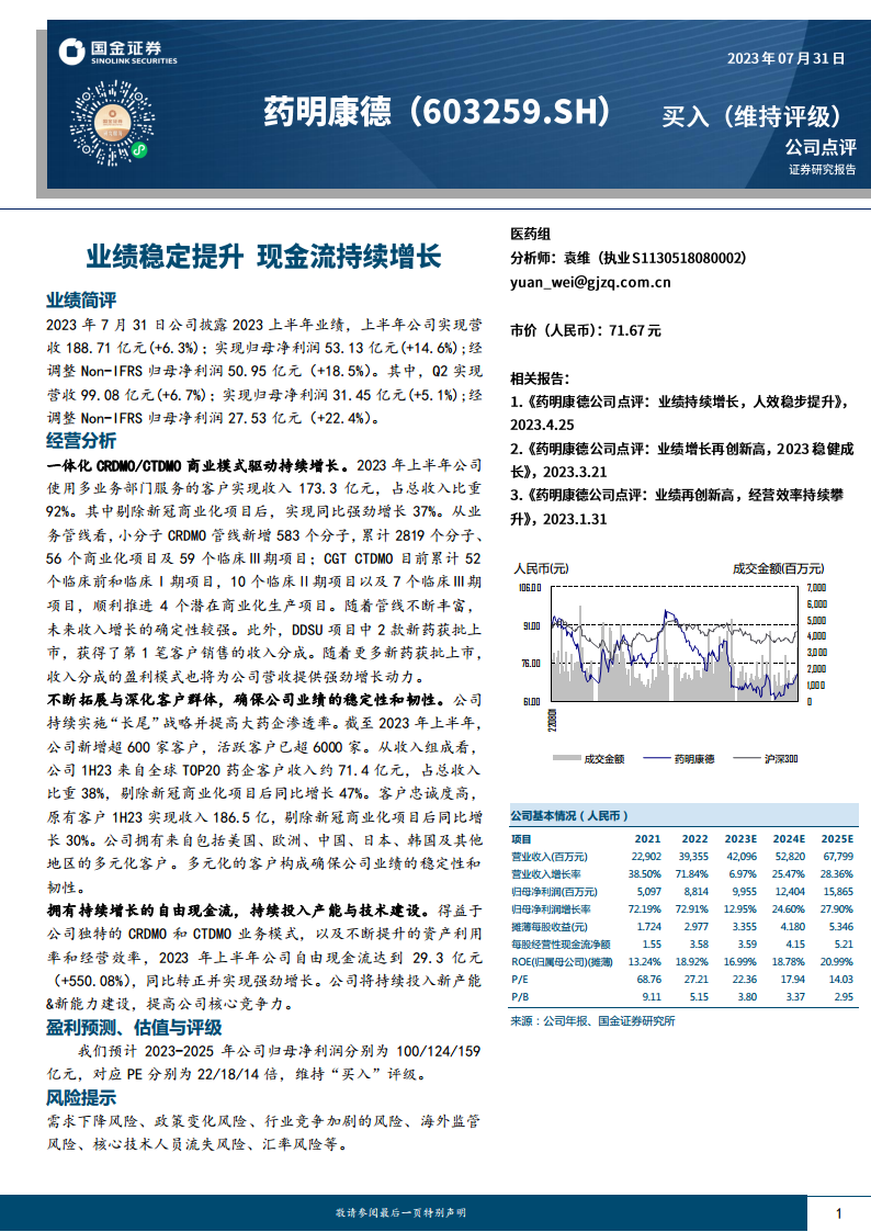 药明康德在2023年上半年展现出强劲的业绩增长和卓越的经营韧性,营收和归母净利润均实现双位数增长,尤其在剔除新冠商业化项目后,核心业务的内生增长动力显著。公司一体化CRDMO/CTDMO商业模式持续驱动各业务板块发展,化学业务在TIDES新分子业务的强劲放量下,有效抵消了新冠项目收入下降的影响;测试业务和生物学业务凭借领先的技术平台和市场地位,实现了稳健增长;CGT CTDMO业务管线持续扩张,多个项目有望在近期迎来商业化突破,预示着未来增长潜力。国内新药研发服务部业务虽然短期承压,但新药销售分成模式的成功启动,为长期增长开辟了新路径。公司通过持续拓展客户群体、深化合作,并保持高客户忠诚度,确保了业绩的稳定性和多元化。同时,强劲的自由现金流为公司持续投入产能和技术创新提供了保障。基于对公司未来盈利能力的积极预测,维持“买入”评级,但需关注需求下降、政策变化、行业竞争加剧、海外监管、核心技术人员流失及汇率波动等潜在风险。