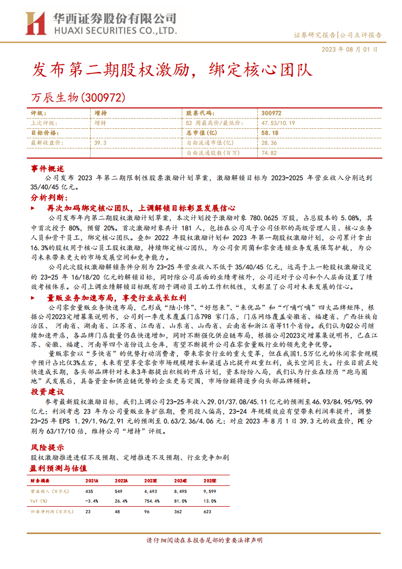 万辰生物通过发布高目标的第二期股权激励计划,明确表达了公司对未来业绩增长的强大信心和决心,并有效绑定了核心团队。同时,公司在零食量贩业务上的加速布局和品牌矩阵的构建,使其能够充分把握休闲零食市场巨大的成长机遇。尽管2023年因业务扩张费用投入较高,但预计未来两年规模效应将显著提升利润率。综合来看,公司凭借战略性的激励机制和快速扩张的量贩业务,展现出强劲的增长潜力,维持“增持”评级。投资者需关注股权激励、定增推进及行业竞争等潜在风险。