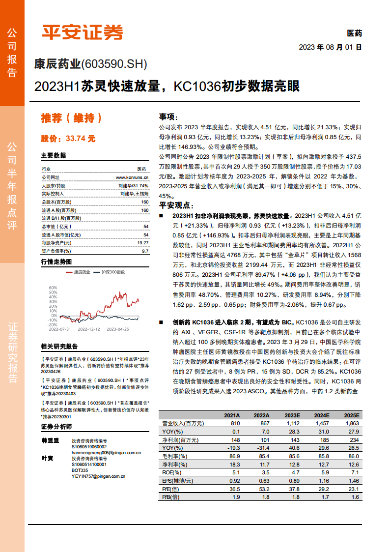 本报告核心观点指出,康辰药业在2023年上半年实现了显著的业绩增长,特别是扣除非经常性损益后的归母净利润同比大幅增长146.93%,表现亮眼。这主要得益于核心产品“苏灵”的快速放量,其销量同比增长49%,带动公司毛利率提升。同时,公司在创新药研发方面取得重要进展,多靶点抑制剂KC1036进入临床2期,初步临床数据显示出优异的疗效和安全性,有望成为同类最佳(BIC)药物,为公司长期发展注入强劲动力。