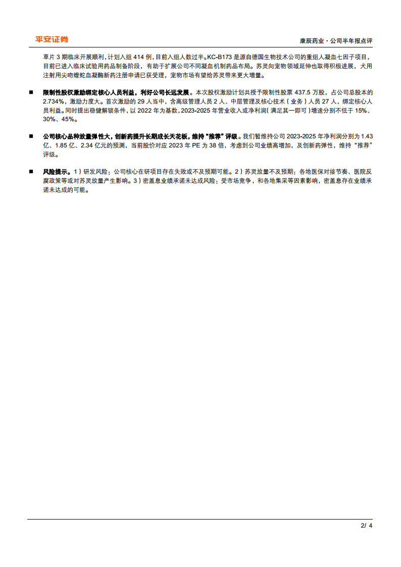 公司通过实施限制性股票激励计划,有效绑定了高级管理人员及核心技术(业务)人员的利益,并设定了稳健的业绩解锁条件,即2023-2025年营业收入或净利润增速分别不低于15%、30%、45%。这一举措不仅有利于激发团队积极性,确保公司战略目标的实现,也体现了公司对未来业绩增长的信心。综合来看,康辰药业凭借核心品种的放量弹性、创新药管线的持续推进以及完善的激励机制,展现出良好的长期成长潜力,维持“推荐”评级。