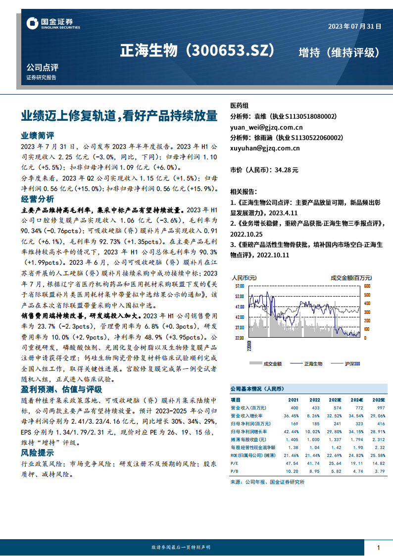 基于种植牙集采政策落地和可吸收硬脑(脊)膜补片集采的积极进展,预计公司主要产品将持续放量。报告预测2023-2025年公司归母净利润分别为2.41亿元、3.23亿元和4.16亿元,同比增长30%、34%和29%。对应EPS分别为1.34元、1.79元和2.31元,现价对应PE分别为26倍、19倍和15倍。鉴于此,报告维持公司“增持”评级。