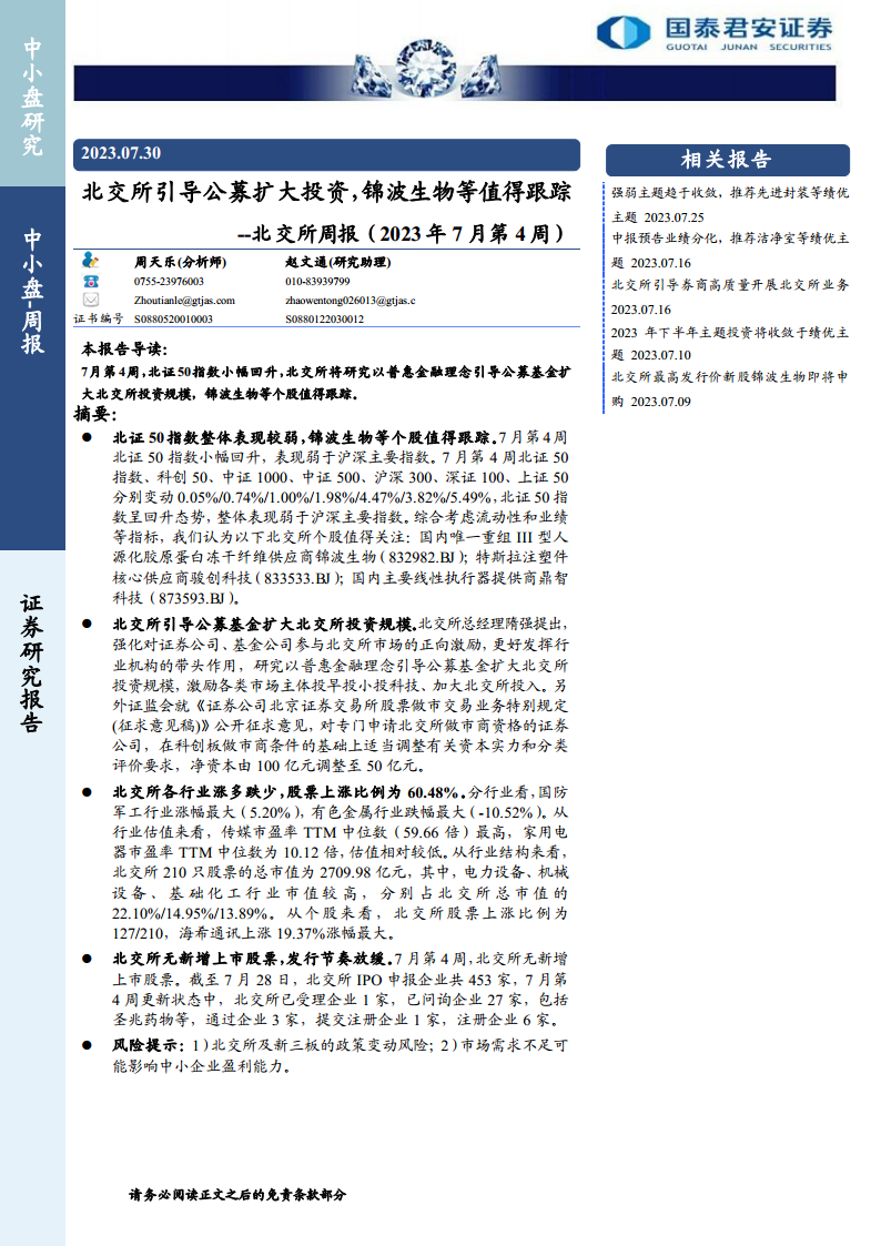 北交所周报(2023年7月第4周):北交所引导公募扩大投资,锦波生物等值得跟踪