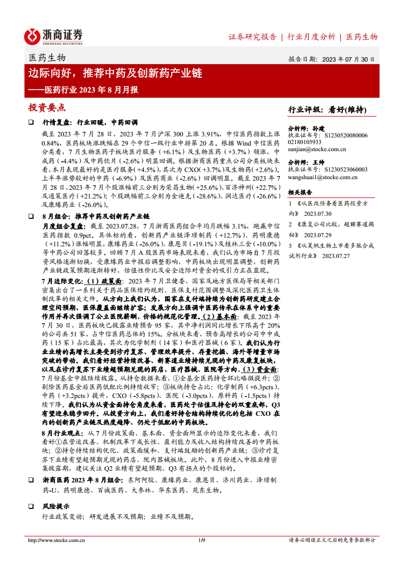 综合7月份政策面、基本面和资金面的边际变化,报告看好:1)在营运改善、机制改革下成长性、盈利能力及收入结构持续改善的中药板块;2)持仓持续结构优化、政策面缓和、支付端鼓励的创新药产业链;3)诊疗复苏下业绩有望超预期兑现的药店、院内器械板块。此外,建议关注8月份中报业绩密集披露期中,Q2业绩有望超预期、Q3有拐点的个股标的。 浙商医药2023年8月组合包括:东阿阿胶、康缘药业、康恩贝、济川药业、泽璟制药-U、药明康德、百诚医药、大参林、华东医药、苑东生物。