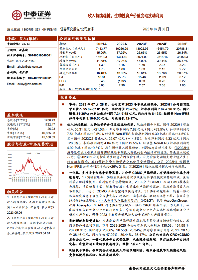 康龙化成在2023年上半年实现了稳健的营收增长,尽管短期内利润受到海外运营成本、生物性资产公允价值变动及股权激励摊销等因素的扰动。公司凭借其在实验室服务、小分子CDMO、临床研究以及大分子和细胞基因治疗领域构建的一体化、多疗法服务平台,展现出强大的竞争优势和未来增长潜力。分析师维持“买入”评级,并预计公司未来几年营收和归母净利润将持续快速增长,但需关注创新药研发投入、CMC业务毛利率、市场竞争及汇率波动等潜在风险。