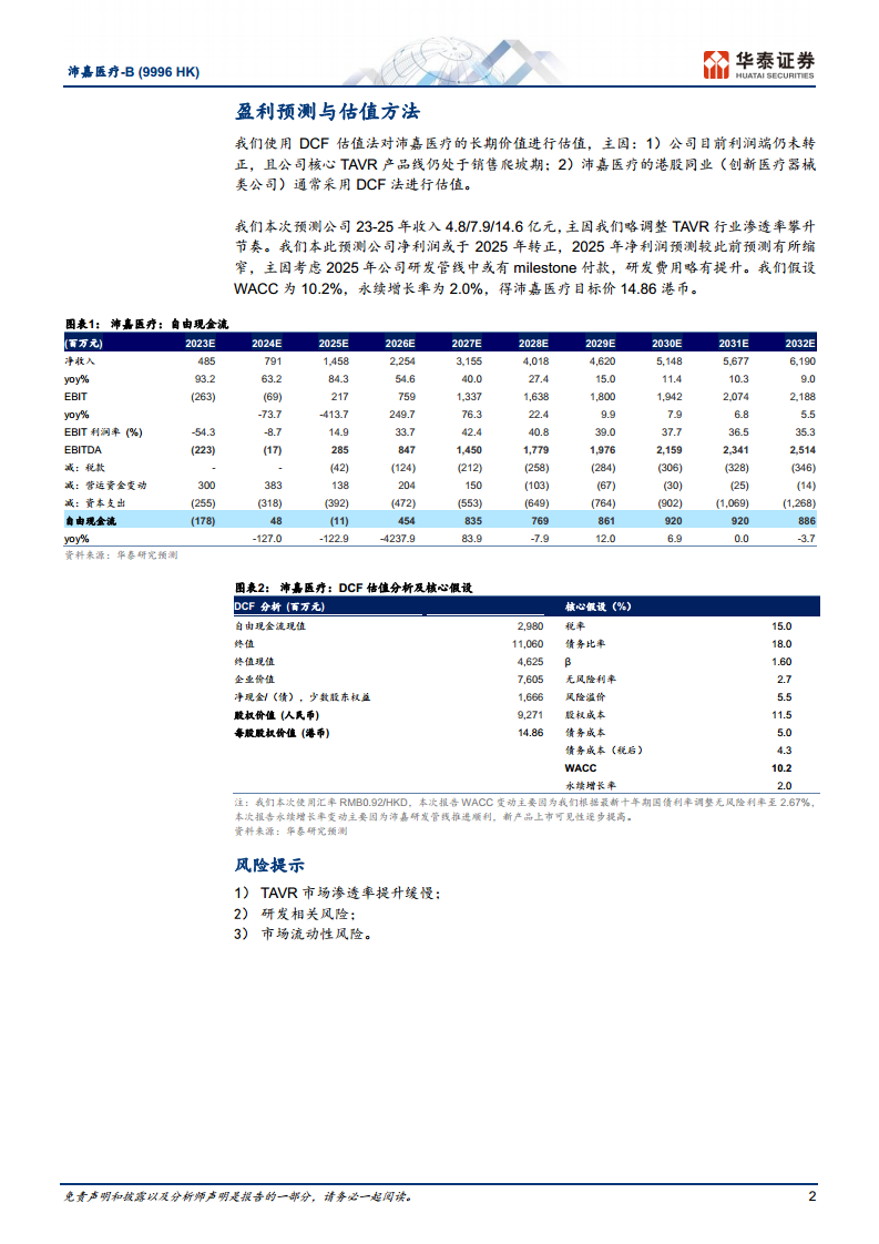 华泰研究采用DCF估值法对沛嘉医疗进行长期价值评估,主要考虑到公司目前利润端尚未转正且核心TAVR产品线仍处于销售爬坡期,以及港股创新医疗器械类公司通常采用DCF法估值。报告预测公司2023-2025年收入分别为4.8亿元、7.9亿元和14.6亿元人民币,并预计净利润将于2025年转正。基于WACC 10.2%和永续增长率2.0%的假设,维持沛嘉医疗14.86港币的目标价。WACC的变动主要由于根据最新十年期国债利率调整无风险利率至2.67%,永续增长率的变动则因沛嘉研发管线推进顺利,新产品上市可见性逐步提高。