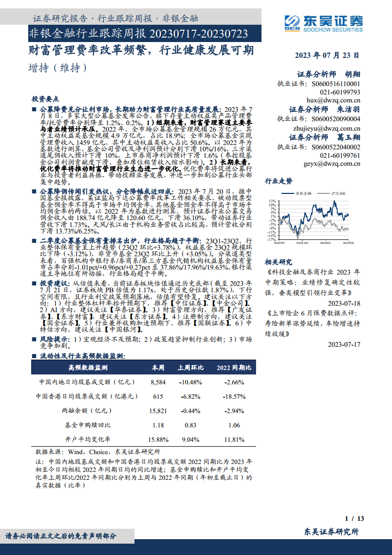 非银金融行业跟踪周报:财富管理费率改革频繁,行业健康发展可期