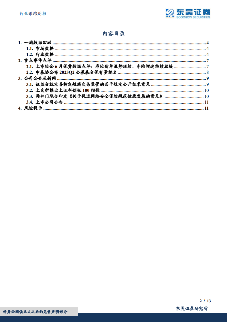 截至2023年7月21日,本周(07.17-07.21)市场表现:上证指数下跌2.16%,金融指数下跌1.16%,非银金融板块下跌1.46%(其中券商板块下跌0.23%,保险板块下跌4.29%)。