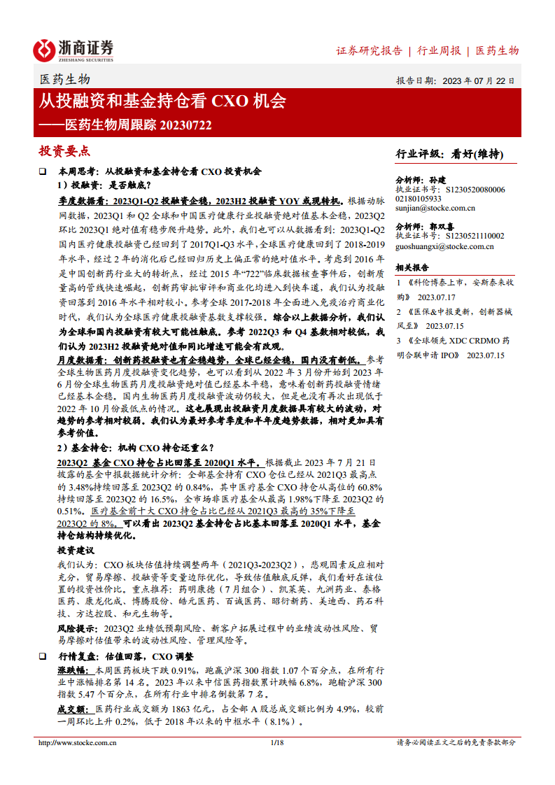 本报告核心观点指出,医药生物行业中的CXO(医药研发生产外包)板块在经历两年估值调整后,已显现出触底反弹的投资机会。这主要基于投融资活动的企稳迹象和机构基金持仓占比的显著回落。数据显示,全球及国内医疗健康投融资绝对值在2023年上半年趋于稳定并有爬升趋势,预计下半年同比增速将有所改观。同时,基金对CXO的持仓已降至2020年第一季度水平,表明悲观情绪已充分释放,估值具备较高性价比。