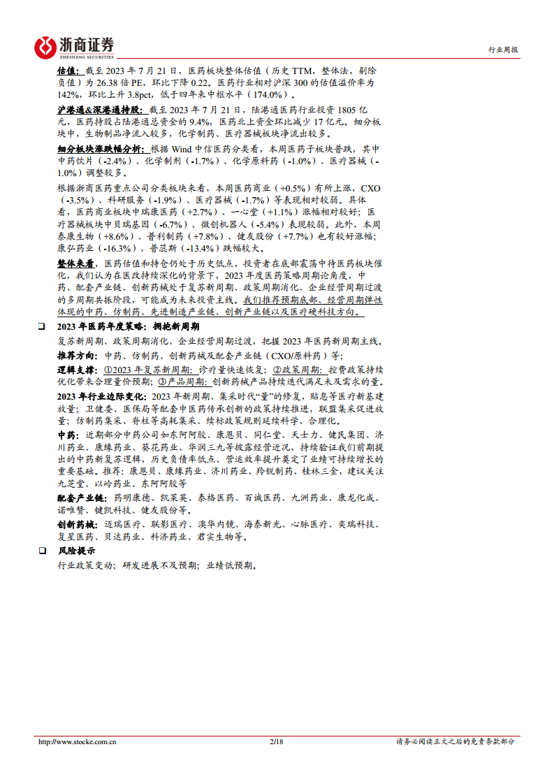 报告进一步分析,在医改持续深化背景下,2023年医药行业正处于“复苏新周期、政策周期消化、企业经营周期过渡”的多周期共振阶段。诊疗量快速恢复、控费政策优化以及创新药械产品迭代共同构成了行业增长的逻辑支撑。在此背景下,中药、仿制药、先进制造产业链、创新产业链以及医疗硬科技方向被视为未来投资主线,具备预期底部和经营周期弹性。