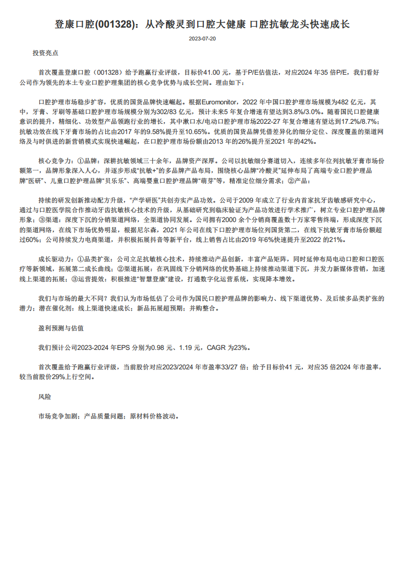 报告预计登康口腔2023年和2024年EPS分别为0.98元和1.19元,复合年增长率(CAGR)为23%。首次覆盖给予“跑赢行业”评级,当前股价对应2023/2024年市盈率分别为33倍和27倍。给予目标价41元,对应2024年35倍市盈率,较当前股价有29%的上行空间。