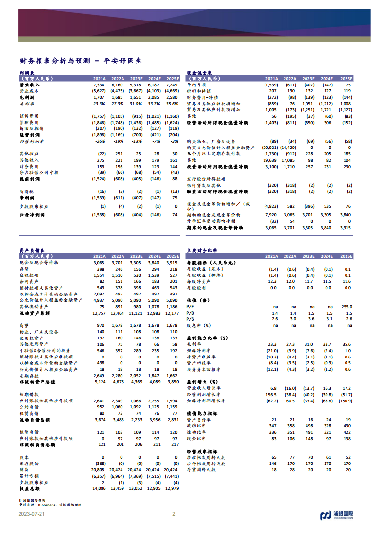 浦银国际对平安好医生的财务预测进行了调整。由于1H23低战略协同性业务缩减对收入的影响超出此前预期,2023-2025年收入预测被下调23-29%,分别至人民币53亿、62亿和72亿元。然而,业务结构优化后,高毛利率的高战略协同性业务占比提升,预计将进一步提振毛利率。因此,2023-2025年毛利率预测被上调2-5个百分点,分别至31.0%、33.7%和35.6%。尽管收入预测下调,但公司仍有望在2025年实现盈亏平衡。