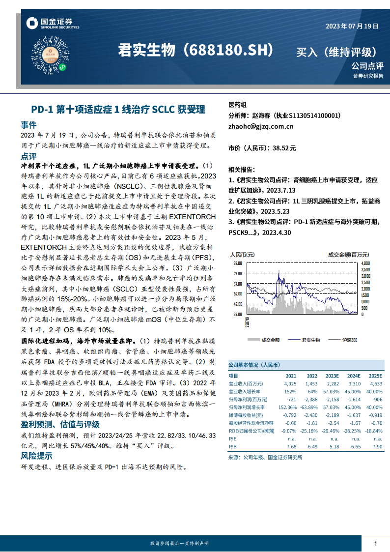 君实生物(688180):PD-1 第十项适应症1线治疗SCLC获受理