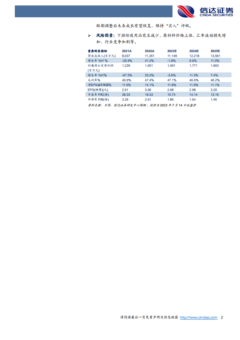 暂不考虑搬迁补偿影响,信达证券维持稳健医疗2023-2025年EPS预测为2.68/2.98/3.20元。目前股价对应23年15.74倍PE。信达证券看好公司健康消费业务同比快速增长,认为未来成长空间较大;医疗业务短期调整后未来成长有望恢复,维持“买入”评级。风险因素包括下游防疫用品需求减少、原材料价格上涨、汇率波动损失增加、行业竞争加剧等。