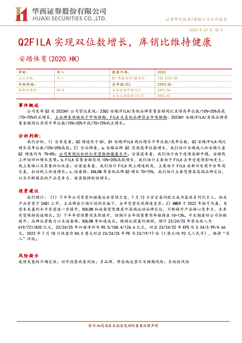 公司通过优化线上策略、改善零售折扣及加强品牌营销,有效维持了健康的库销比和折扣水平。预计下半年主品牌有望复苏,AMER体育盈利能力持续提升,且整体财务指标向好,盈利预测稳健,华西证券维持“买入”评级。
