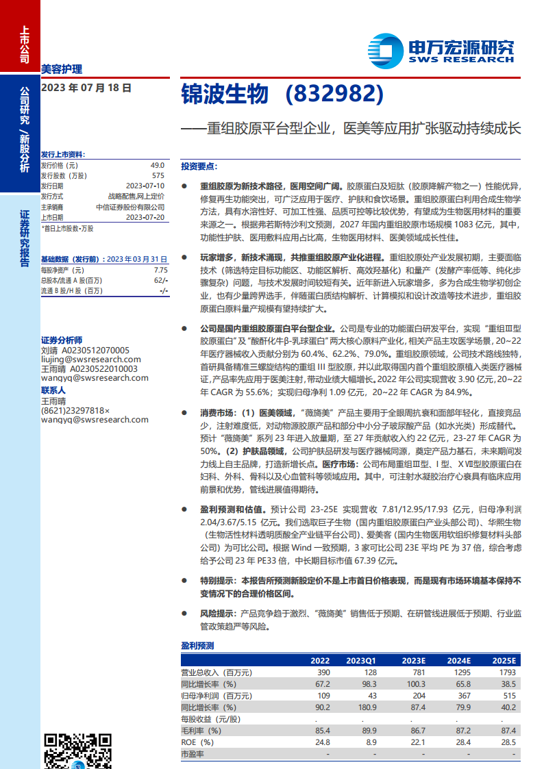 根据发行公告,锦波生物本次发行价格为49元/股,对应公司市值为32.99亿元(不考虑超额配售),2022年归母净利润为1.09亿元,发行价格对应静态市盈率为30.22倍。报告选取巨子生物、华熙生物和爱美客作为可比公司,根据Wind一致预期,三家可比公司2023年平均市盈率为37倍。综合考虑锦波生物在重组胶原蛋白领域的技术领先地位和市场竞争优势,以及北交所流动性可能导致的折价效应,给予公司2023年33倍的市盈率,中长期目标市值定为67.39亿元。