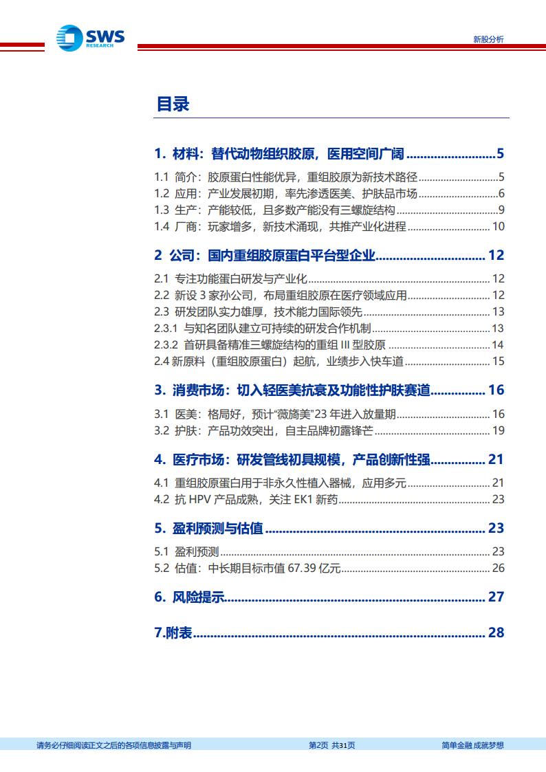 报告提示了多项风险,包括:重组胶原蛋白行业竞争趋于激烈,可能影响公司营收及业绩增长;“薇旖美”系列产品销售受渠道铺设、医美机构运营能力、求美者认可度及复购率等因素影响,存在销售低于预期的可能;在研管线(特别是Ⅲ类医疗器械和生物药品)研发注册周期长、不确定因素多,进展可能低于预期;以及行业监管政策趋严,若公司未能遵守监管规定或产品出现问题,可能对业务及经营业绩产生不利影响。