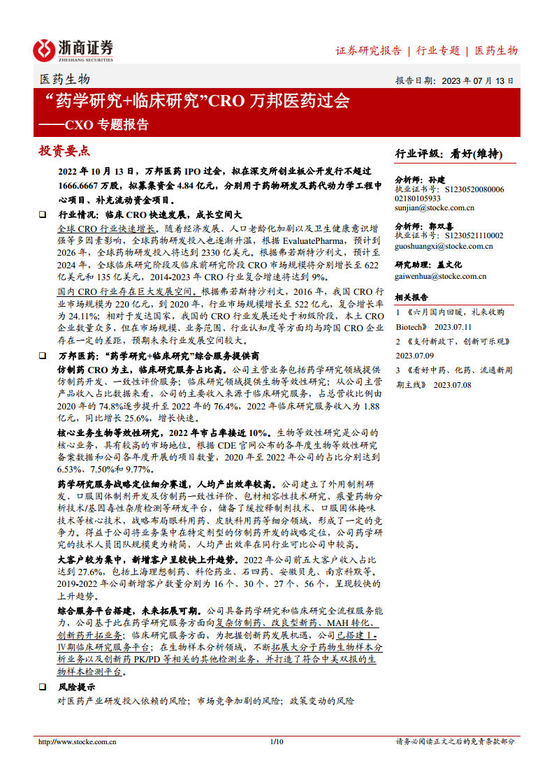 医药生物CXO专题报告:“药学研究+临床研究”CRO万邦医药过会