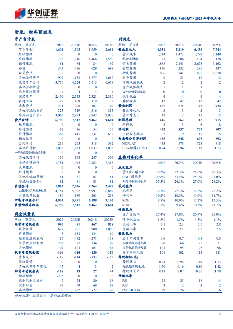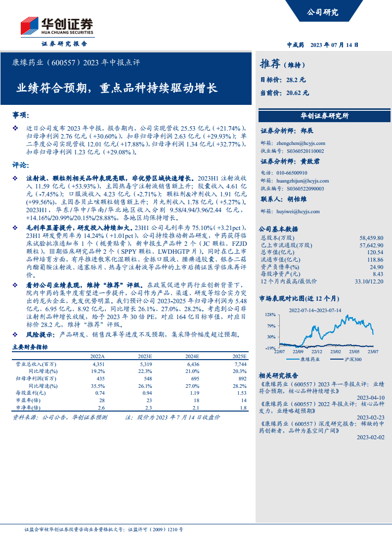 分析师对康缘药业的未来业绩表现持乐观态度,并维持“推荐”的投资评级。在当前政策积极促进中药行业创新的背景下,院内中药的集中度有望进一步提升。康缘药业作为一家在产品、渠道和研发等方面综合实力突出的龙头企业,具备明显的先发优势。 基于对公司未来发展的判断,分析师预测康缘药业2023年至2025年的归母净利润将分别为5.48亿元、6.95亿元和8.92亿元人民币,同比增速分别为26.1%、27.0%和28.2%。考虑到公司非注射剂品种增长可能放缓的因素,分析师给予公司2023年30倍市盈率(PE),对应目标市值164亿元人民币,目标价为28.2元人民币。