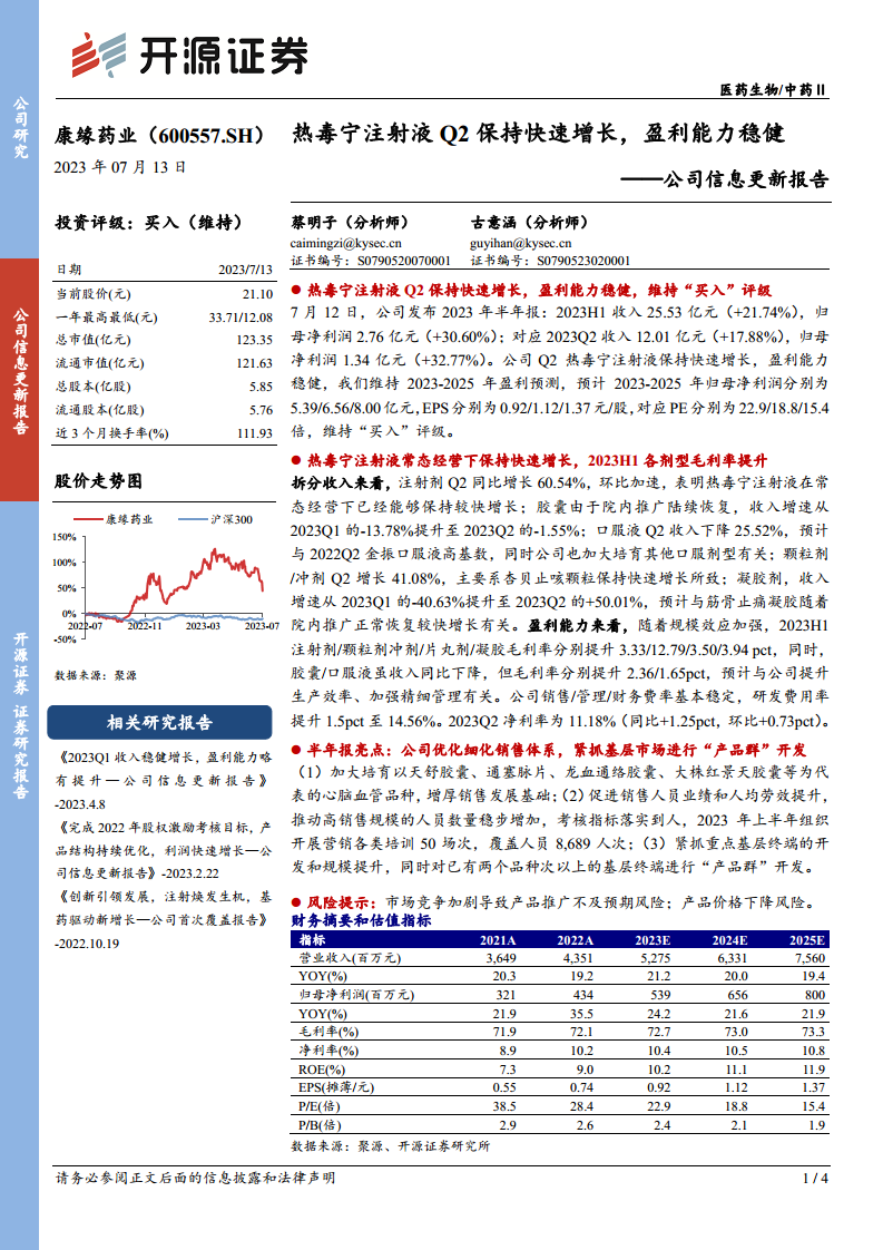 本报告的核心观点在于,康缘药业(600557.SH)在2023年上半年,特别是第二季度,展现出强劲的经营韧性和增长潜力。其核心产品热毒宁注射液在常态化市场环境下保持了显著的快速增长,成为公司业绩增长的主要驱动力。与此同时,公司通过精细化管理和规模效应的发挥,实现了整体盈利能力的稳健提升,净利率水平持续优化。这不仅巩固了公司在医药生物,特别是中药领域的市场地位,也为其未来的可持续发展奠定了坚实基础。