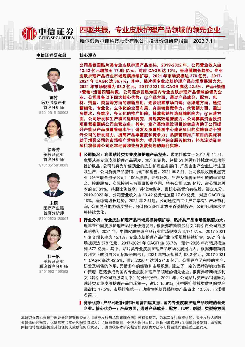 敷尔佳-A21475-哈尔滨敷尔佳科技股份有限公司投资价值研究报告:四驱共振,专业皮肤护理产品领域的领先企业