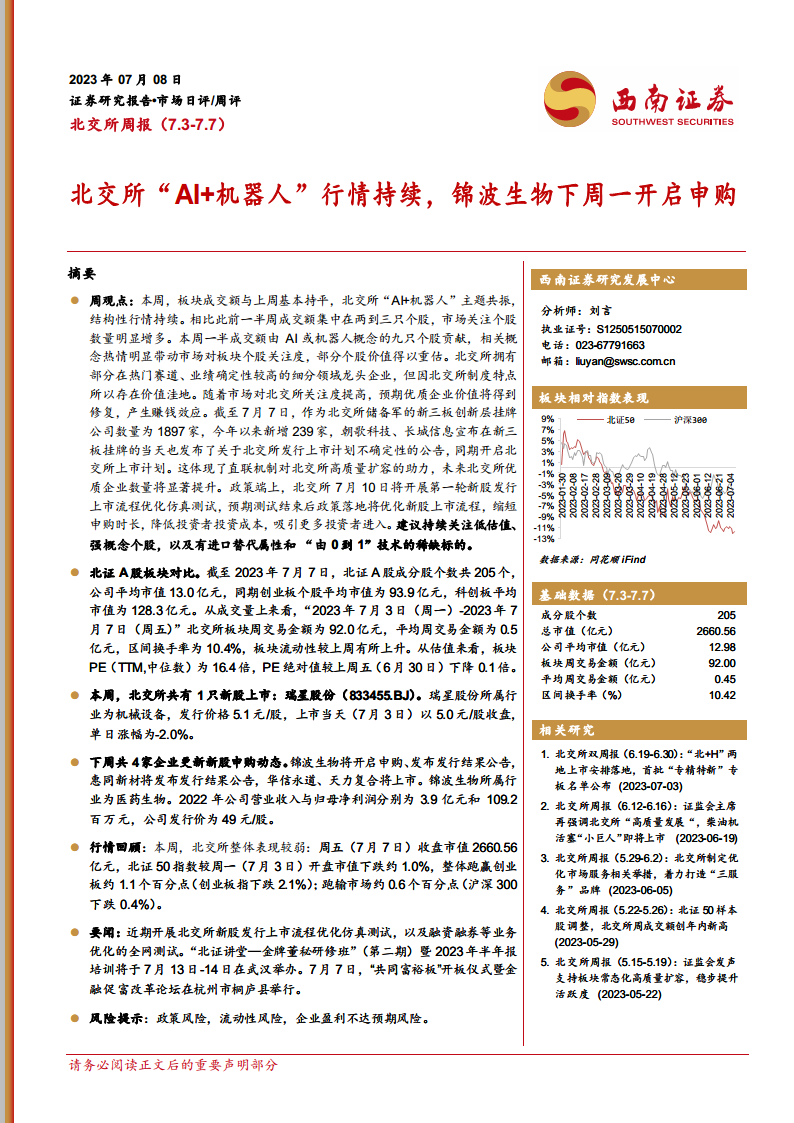 截至2023年7月7日,北证A股成分股数量为205个,公司平均市值13.0亿元,远低于创业板(93.9亿元)和科创板(128.3亿元)。本周北交所板块周交易金额为92.0亿元,平均周交易金额0.5亿元,区间换手率为10.4%,流动性较上周有所上升。板块PE(TTM,中位数)为16.4倍,较上周五下降0.1倍,显示出相对较低的估值水平。