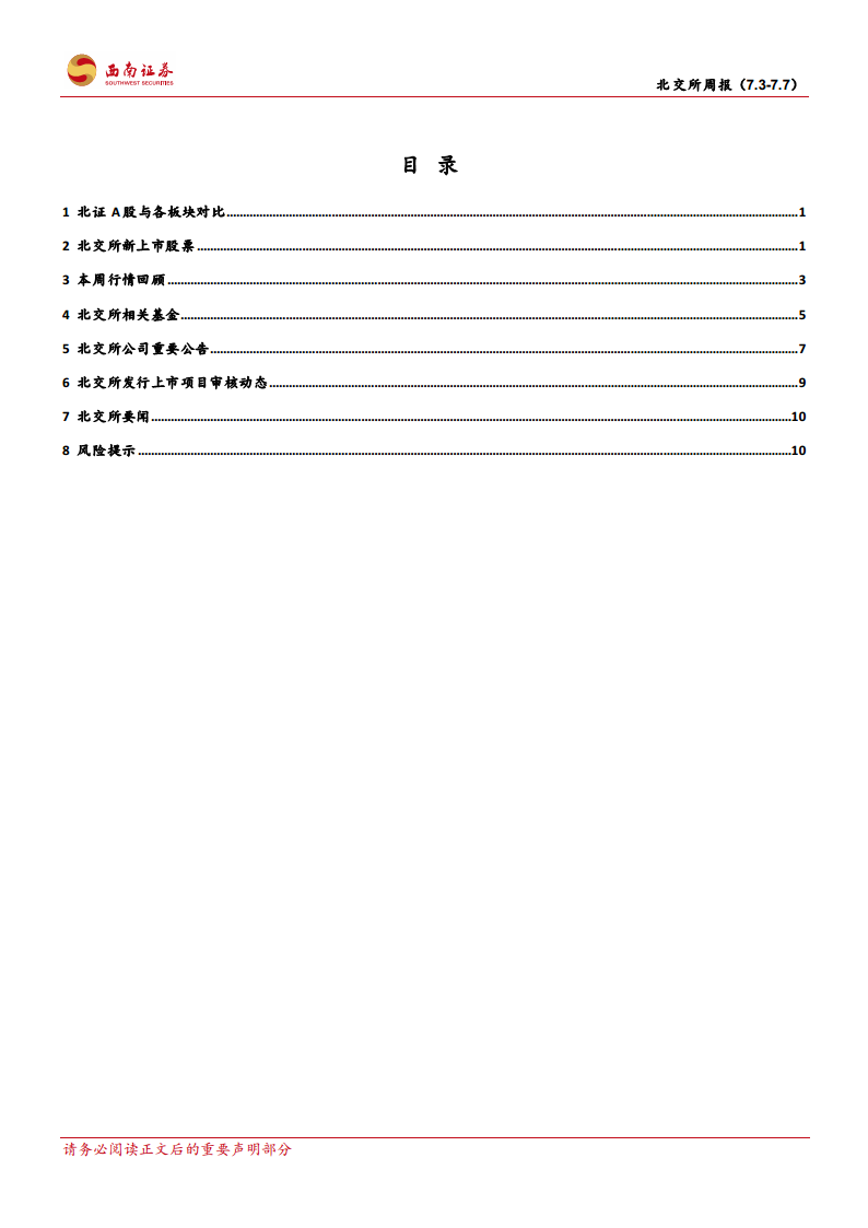 本周(7月3日-7月7日),北交所整体表现偏弱,北证50指数较周一开盘市值下跌约1.0%,收盘市值2660.6亿元。北证50指数跑赢创业板约1.0个百分点(创业板指下跌2.1%),但跑输沪深300约0.6个百分点(沪深300下跌0.4%)。