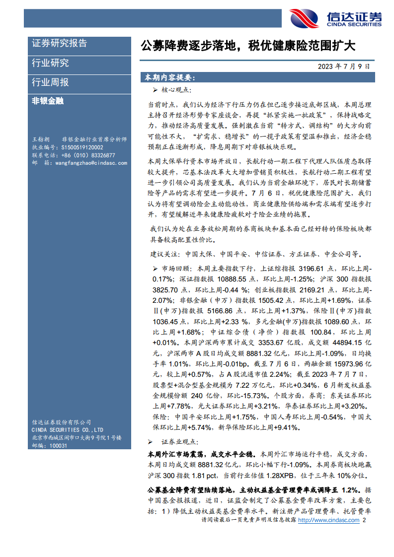 本周券商板块跑赢沪深300指数1.81个百分点,当前行业估值1.28X PB,处于近三年10%分位,配置性价比高。证监会近日制定了公募基金费率改革方案,主要措施包括:1)降低主动权益类基金费率水平,新注册产品管理费率、托管费率分别不超过1.2%、0.2%,存量产品争取在2023年底前降至此水平以下;2)推出更多浮动费率产品;3)规范公募基金证券交易佣金费率,预计2023年底前完成;4)规范基金销售环节收费,预计2024年底前完成;5)完善费率披露机制。配套措施还包括大力引入中长期资金、支持基金公司拓宽收入来源、降低运营成本等。这些改革旨在优化基金投资环境,降低交易成本,提升收益水平,更好地适应个人养老金政策,并为资本市场引入长期资金,有望催化权益公募基金规模增长。 展望未来,经济持续回升向好趋势和增量经济驱动政策的出台,将提振市场信心,推升交投活跃度,利好券商板块。证券公司作为服务实体经济的关键环节,有望在新一轮政策中获得机遇。券商ROE提升是关注重点,2023年第一季度上市券商杠杆率(除客户资金)已从年初的3.71倍提升至3.93倍,预计两融标的扩容和财富管理业务发展将有效助推券商ROE中枢抬升。建议关注用表能力较强的头部券商如中信证券、中金公司,以及融资端改善、资本中介业务底部反转逻辑较强的方正证券。