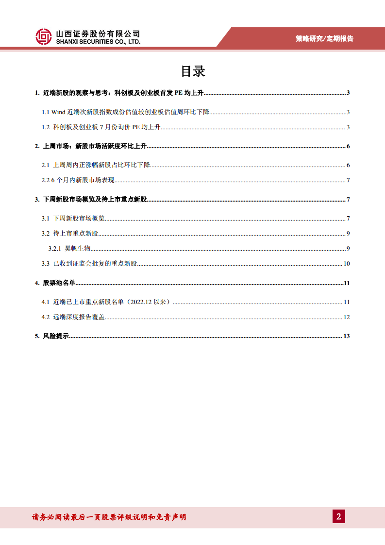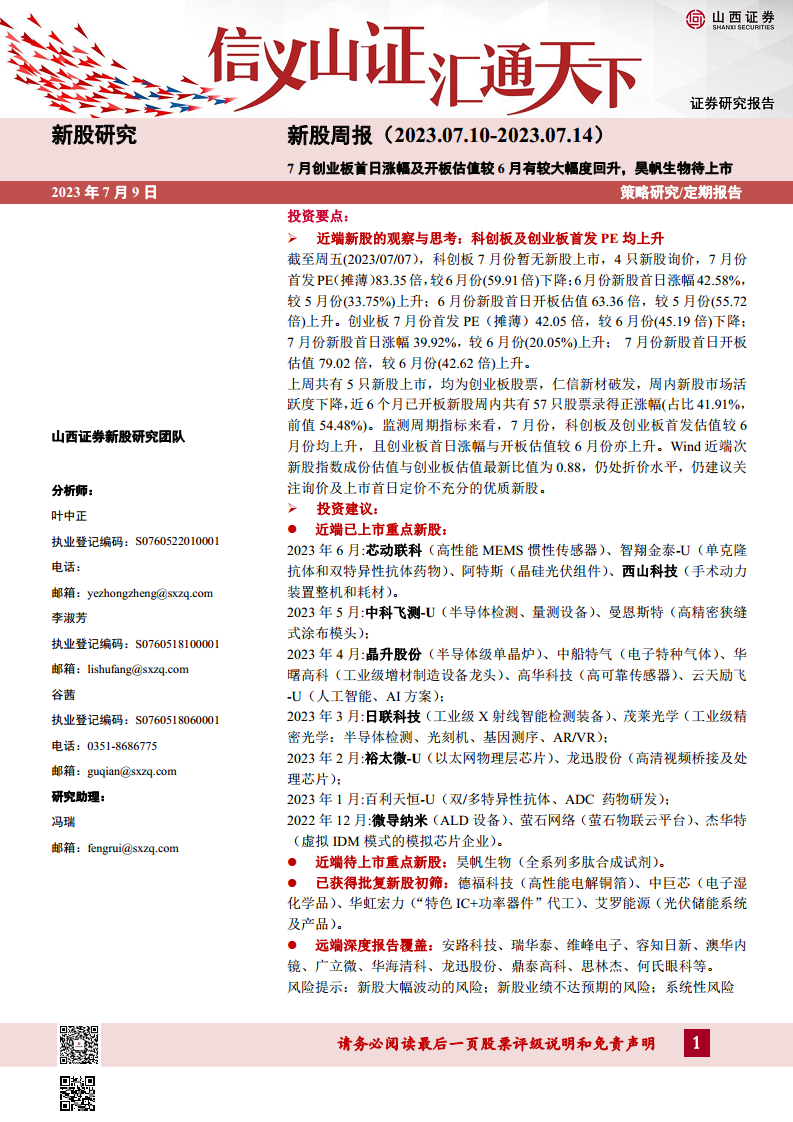本周报对2023年7月10日至7月14日的新股市场进行了专业分析,指出创业板首日涨幅和开板估值显著回升,而科创板和创业板首发PE有所下降。尽管市场活跃度有所减弱,但次新股估值折价为优质新股提供了投资机会。报告重点推荐了待上市的昊帆生物,并筛选了德福科技、中巨芯、华虹宏力、艾罗能源等已获批复的优质新股。同时,报告更新了近端已上市和远端深度覆盖的股票池,并强调了新股投资中可能面临的波动、业绩不达预期及系统性风险,建议投资者审慎决策。