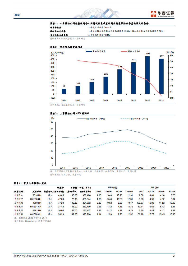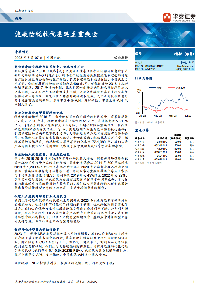 本次金融监管总局将商业健康险个税优惠政策扩展至重疾险和长期护理险,是监管机构鼓励发展保障型业务的重要信号。尽管个税优惠额度不变,但产品和被保险人范围的扩大,预计将显著提振重疾险的销售,为市场带来新的增长点,并有望扭转重疾险新单保费近年来的下滑趋势。结合寿险行业代理人转型升级带来的产能提升,以及新业务价值(NBV)有望在2023年恢复增长,保险行业基本面正持续改善。当前寿险股估值处于历史低位,具备较强的吸引力,行业转型和政策利好共同驱动估值修复,为投资者提供了良好的配置机会。然而,投资者仍需关注NBV持续负增长、权益市场波动及利率下行等潜在风险。
