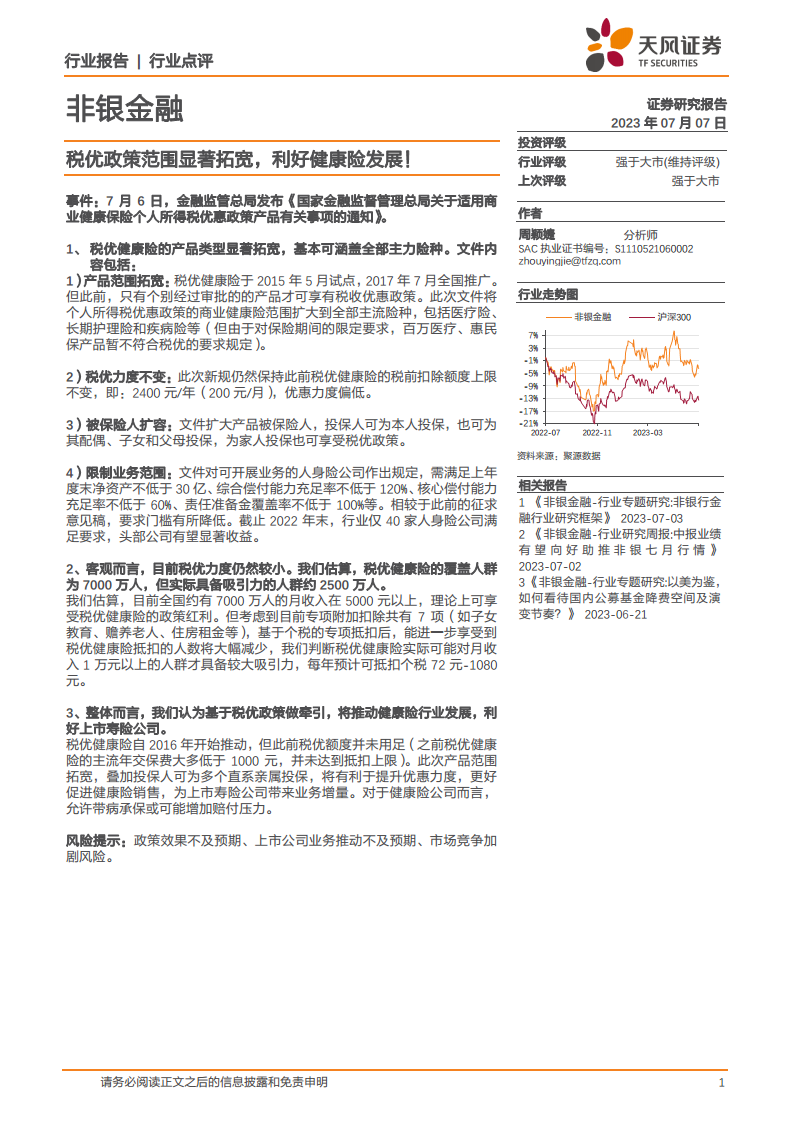 中心思想 税优政策拓宽,健康险发展迎来新机遇 金融监管总局发布的新规显著拓宽了商业健康保险的个人所得税优惠政策适用范围,涵盖医疗险、长期护理险和疾病险等主流险种,并扩大了被保险人范围至配偶、子女和父母,为健康险市场带来了新的发展机遇。 政策利好头部险企,但税优力度仍待提升 尽管当前每年2400元的税前扣除额度相对较低,且实际对高收入人群的吸引力更大,但政策的整体导向预计将推动健康险行业发展,特别是对满足特定资质要求的头部上市寿险公司将带来业务增量。 同时,允许带病承保的规定也可能增加健康险公司的赔付压力,需关注政策效果及市场竞争风险。 主要内容 商业健康险税优政策核心调整与影响 政策实施效果评估及行业发展展望 税优健康险产品类型与被保险人范围显著拓宽 产品范围扩大: 金融监管总局发布的新规将商业健康险的个人所得税优惠政策适用范围显著拓宽,从此前仅限审批产品扩展至医疗险、长期护理险和疾病险等全部主流险种。然而,由于对保险期间的限定,百万医疗和惠民保产品暂不符合税优要求。 税优力度维持: 此次新规保持税前扣除额度上限不变,即2400元/年(200元/月),分析认为优惠力度偏低。 被保险人扩容: 政策允许投保人不仅可为本人投保,还可为配偶、子女和父母投保并享受税优政策,显著扩大了受益人群。 业务资质限制: 文件对可开展税优健康险业务的人身险公司设定了门槛,要求满足上年度末净资产不低于30亿、综合偿付能力充足率不低于120%、核心偿付能力充足率不低于60%、责任准备金覆盖率不低于100%等条件。截至2022年末,行业内仅有40家人身险公司符合要求,预计头部公司将显著受益。 税优政策实际吸引力与覆盖人群分析 理论覆盖人群: 报告估算,全国约有7000万月收入在5000元以上的人群理论上可享受税优健康险的政策红利。 实际吸引力有限: 考虑到子女教育、赡养老人、住房租金等7项专项附加扣除,实际能进一步享受到税优健康险抵扣的人数将大幅减少。分析判断,税优健康险实际可能对月收入1万元以上的人群才具备较大吸引力,每年预计可抵扣个税72元-1080元,表明当前税优力度对大部分潜在受益者吸引力有限。 税优政策对健康险行业发展的推动作用 行业发展牵引: 报告认为,尽管当前税优力度有限,但基于税优政策的牵引作用,将有效推动健康险行业的发展。 利好上市寿险公司: 此次产品范围的拓宽,叠加投保人可为多个直系亲属投保的规定,将有利于提升优惠政策的吸引力,促进健康险销售,为上市寿险公司带来业务增量。 健康险公司面临挑战: 对于专业的健康险公司而言,允许带病承保的规定可能增加其赔付压力。 总结 金融监管总局发布的新规显著拓宽了商业健康保险的税优政策范围,将医疗险、长期护理险和疾病险等主流险种纳入其中,并扩大了被保险人范围至直系亲属。 尽管当前每年2400元的税前扣除额度相对较低,且实际对高收入人群的吸引力更大,但政策的整体导向仍被视为健康险行业发展的重要推动力。 特别是对满足特定资质要求的头部上市寿险公司,预计将带来显著的业务增量。 然而,允许带病承保也可能增加健康险公司的赔付风险。未来,政策效果、上市公司业务推动及市场竞争态势将是影响行业发展的关键因素。