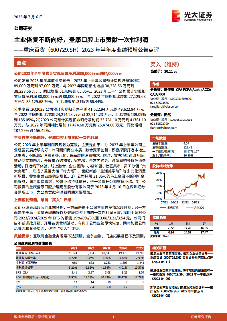 鉴于公司主业恢复情况超出预期,马上金融表现良好以及登康口腔上市带来的额外利润,分析师已上调重庆百货2023年、2024年和2025年的每股收益(EPS)预测,分别上调19%、8%和8%,至3.08元、3.21元和3.54元。