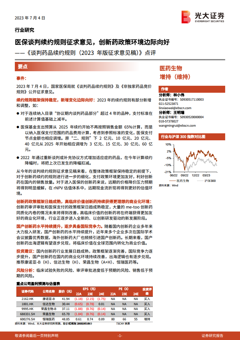 《谈判药品续约规则(2023年版征求意见稿)》点评:医保谈判续约规则征求意见,创新药政策环境边际向好