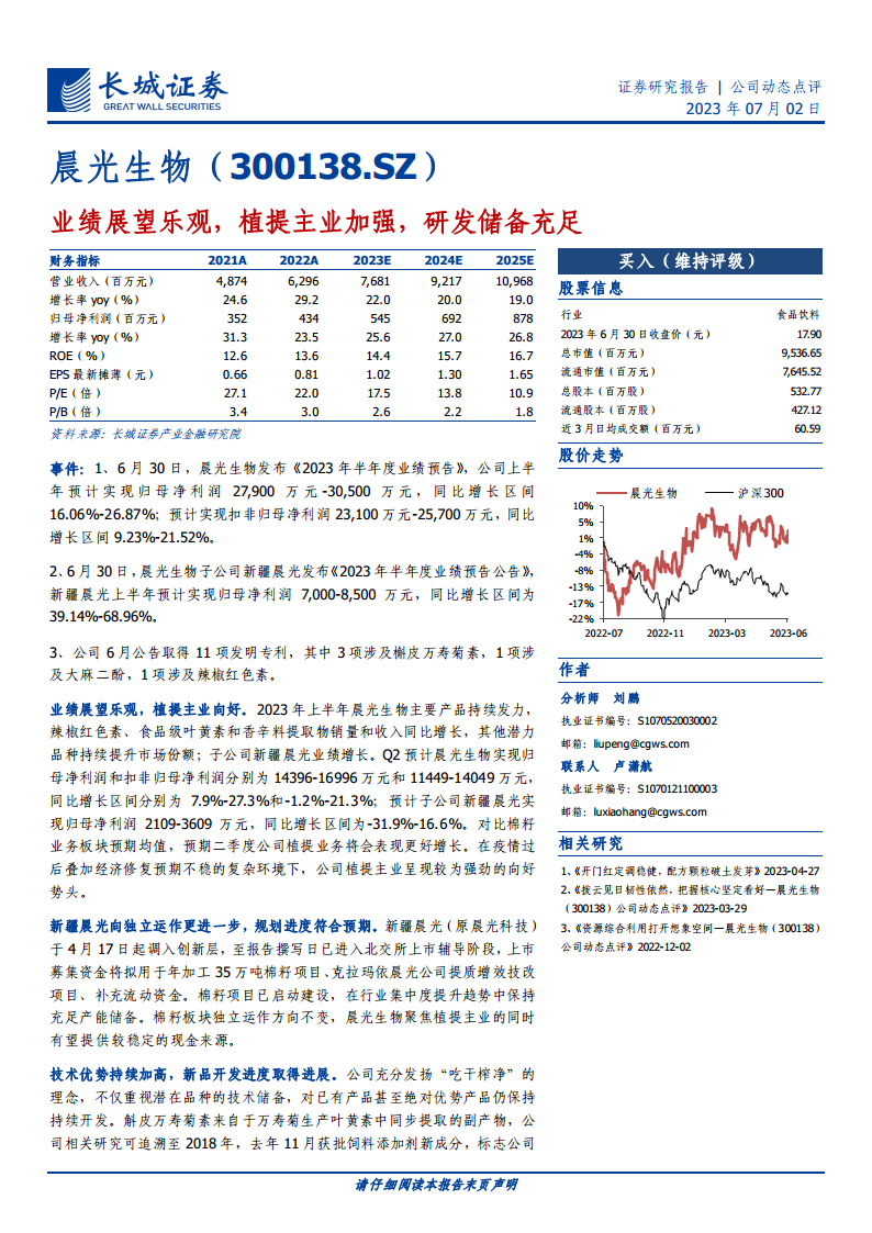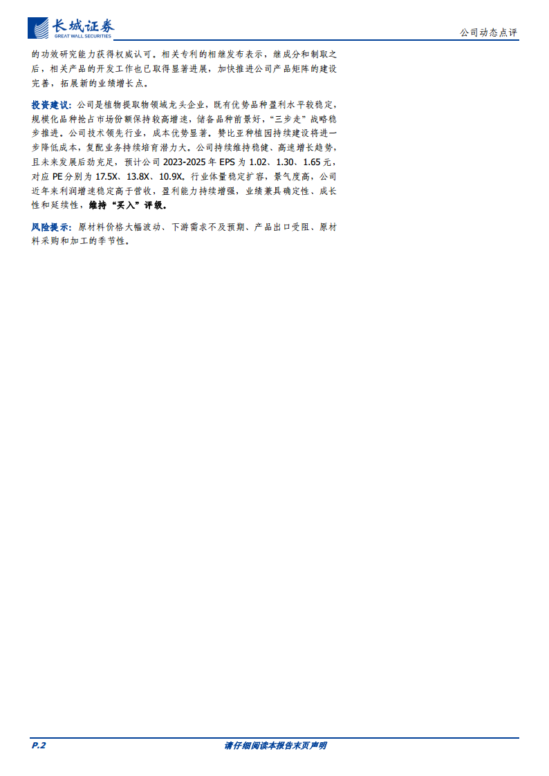 报告维持对晨光生物的“买入”评级。公司作为植物提取物领域的龙头企业,拥有稳定的优势品种盈利水平、高增速的规模化品种以及前景良好的储备品种,并稳步推进“三步走”战略。公司技术领先,成本优势显著,赞比亚种植园的持续建设将进一步降低成本,复配业务潜力巨大。预计公司2023-2025年EPS分别为1.02元、1.30元、1.65元,对应PE分别为17.5X、13.8X、10.9X。公司利润增速稳定高于营收,盈利能力持续增强,业绩兼具确定性、成长性和延续性。 风险提示包括:原材料价格大幅波动、下游需求不及预期、产品出口受阻以及原材料采购和加工的季节性。