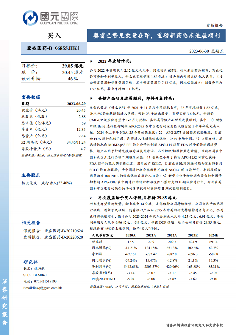 亚盛医药-B(6855.HK)作为一家专注于细胞凋亡领域的创新药企,其核心产品奥雷巴替尼(耐立克®)在2022年实现1.82亿元的销售额,并成功进入医保,预计2023年将迎来销售放量至3.6亿元,且新适应症有望近期获批。同时,公司拥有多款高价值创新产品,如Bcl-2抑制剂APG-2575、MDM2-p53抑制剂APG-115等,在中美两地的临床研发进展顺利,部分产品已进入注册性试验阶段,预计未来几年将陆续商业化,为公司带来持续增长动力。尽管2022年公司因研发和销售投入导致亏损8.83亿元,但分析师预计随着产品放量和管线商业化,公司收入将快速增长,亏损将逐步收窄。基于DCF模型,分析师维持“买入”评级,目标价29.85港元,较现价有46%的上涨空间。投资者需关注医保控费、新产品研发及销售进度等潜在风险。