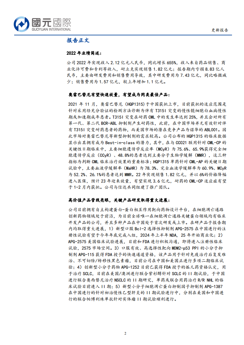 公司在细胞凋亡领域拥有独特的创新管线,多款高价值产品如APG-2575、APG-115、APG-1252和APG-1387在中美两地临床试验进展顺利,部分产品已进入注册性试验阶段。这些产品的陆续商业化将为公司带来新的增长点,支撑长期发展。