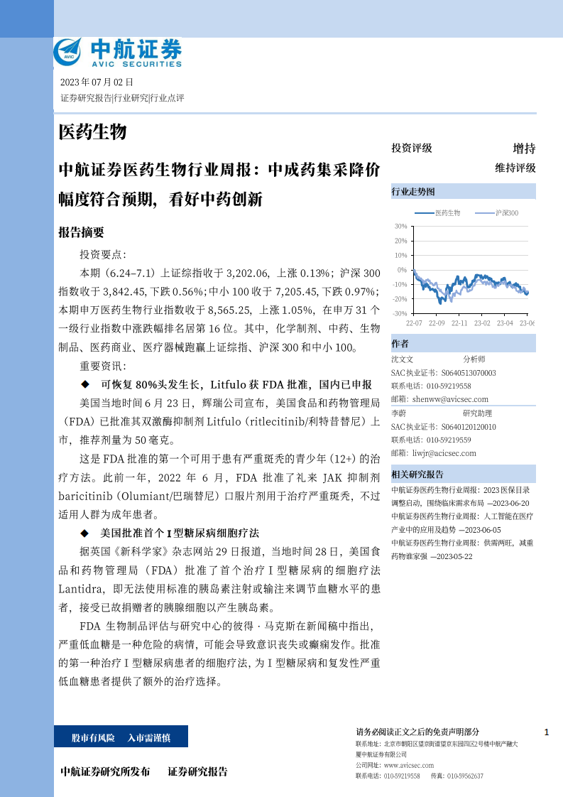 中航证券医药生物行业周报:中成药集采降价幅度符合预期,看好中药创新
