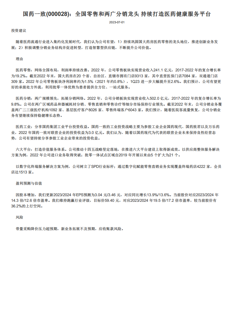 国药一致(000028)全国零售和两广分销龙头,持续打造医药健康服务平台