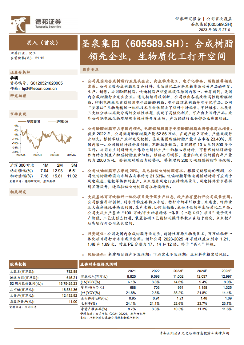 - 投资建议: 德邦证券认为圣泉集团作为国内合成树脂行业龙头,前瞻性布局生物质化工,百万吨秸秆一体化项目将打开未来成长空间。预计公司2023-2025年每股收益分别为1.21元、1.48元和1.69元,对应PE分别为17倍、14倍和12倍。基于此,给予公司“买入”评级。
