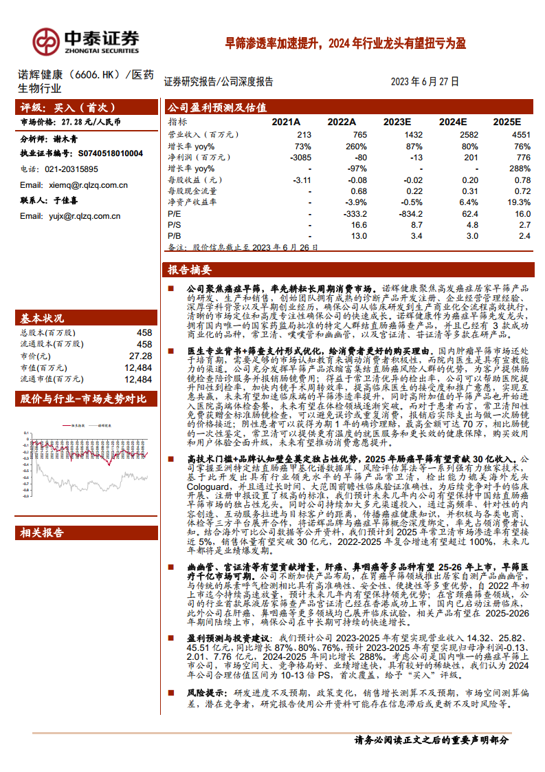 本报告的核心观点在于,诺辉健康凭借其在癌症早筛领域的先发优势、独特技术壁垒及创新的市场推广策略,已确立其行业龙头地位。公司拥有国内唯一经国家药监局批准的特定人群结直肠癌筛查产品“常卫清”,并已成功商业化“常卫清”、“噗噗管”和“幽幽管”三款产品。通过“医生专业背书+筛查支付形式优化”的策略,公司有效提升了消费者购买意愿和市场渗透率。财务数据显示,诺辉健康营业收入持续高速增长,预计2024年将实现扭亏为盈,并在2025年实现显著盈利,展现出巨大的市场潜力和投资价值。